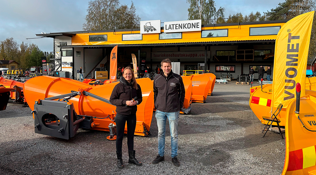 Latenkoneen uuden myyntipihan avajaisia ja talvityölaitesesongin alkamista juhlistettiin uudistetuissa tiloissa. Kuvassa Latenkoneen Lasse Saarenpää ja Minna Välimäki. Jussi Lehtonen 16.10.2025 Latenkone Oy järjesti huutokaupan
