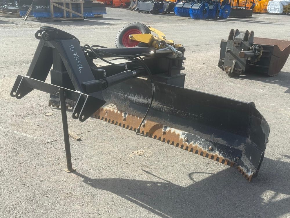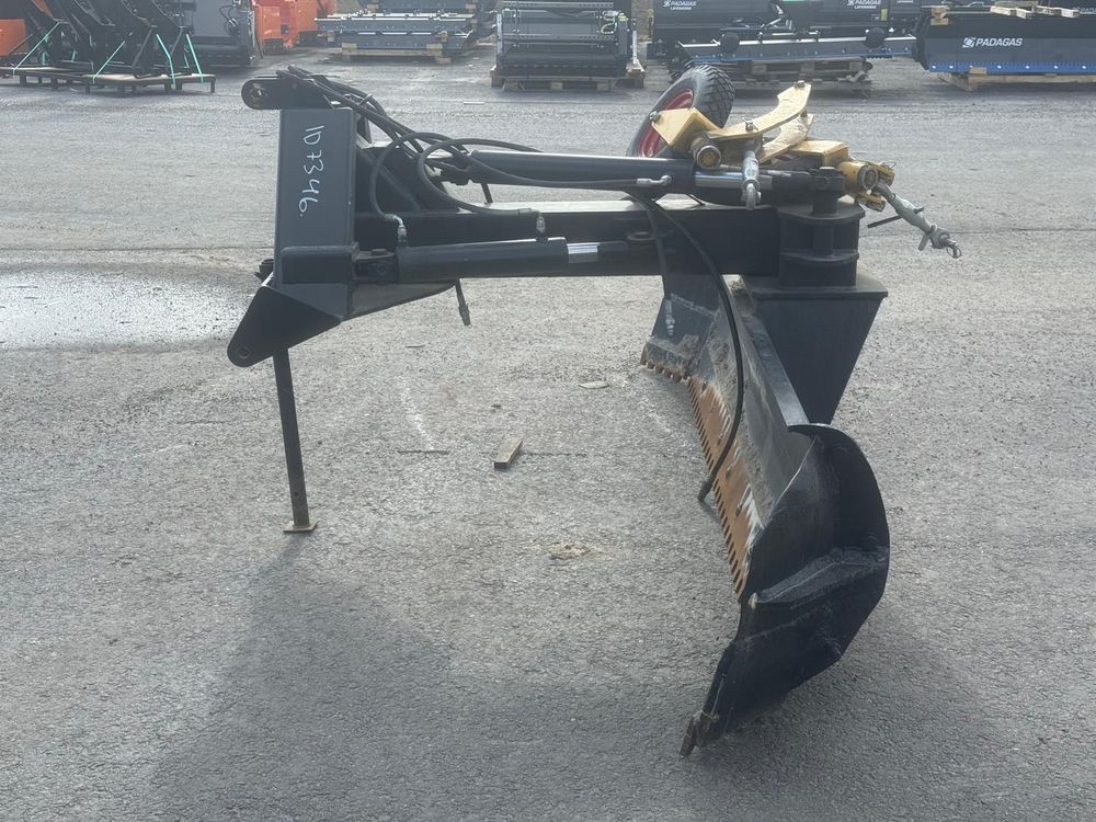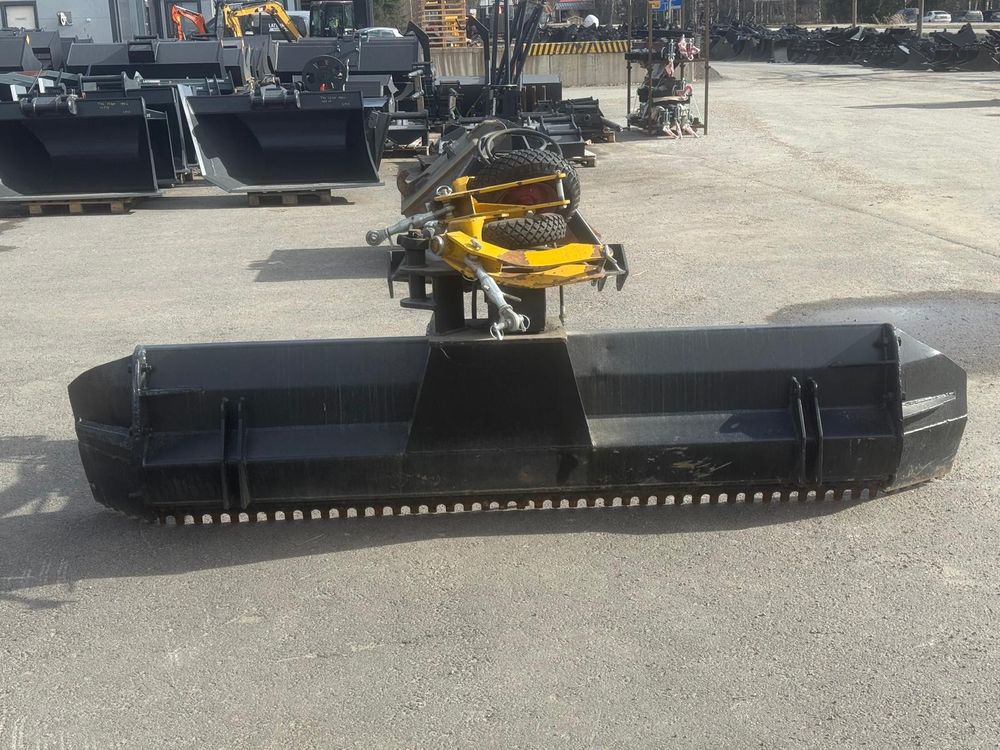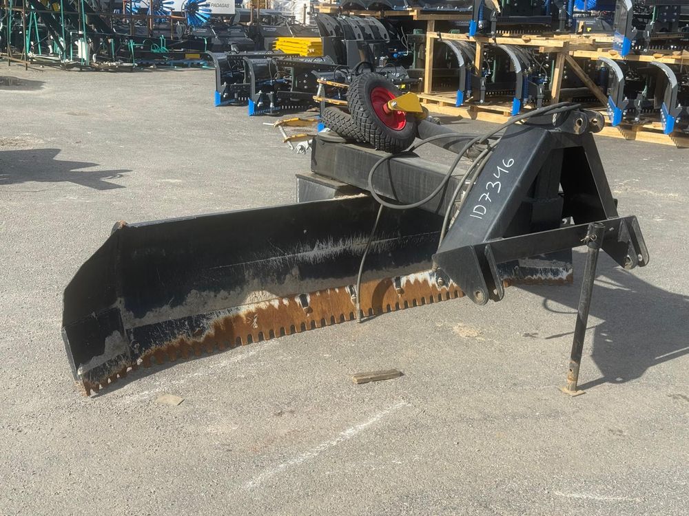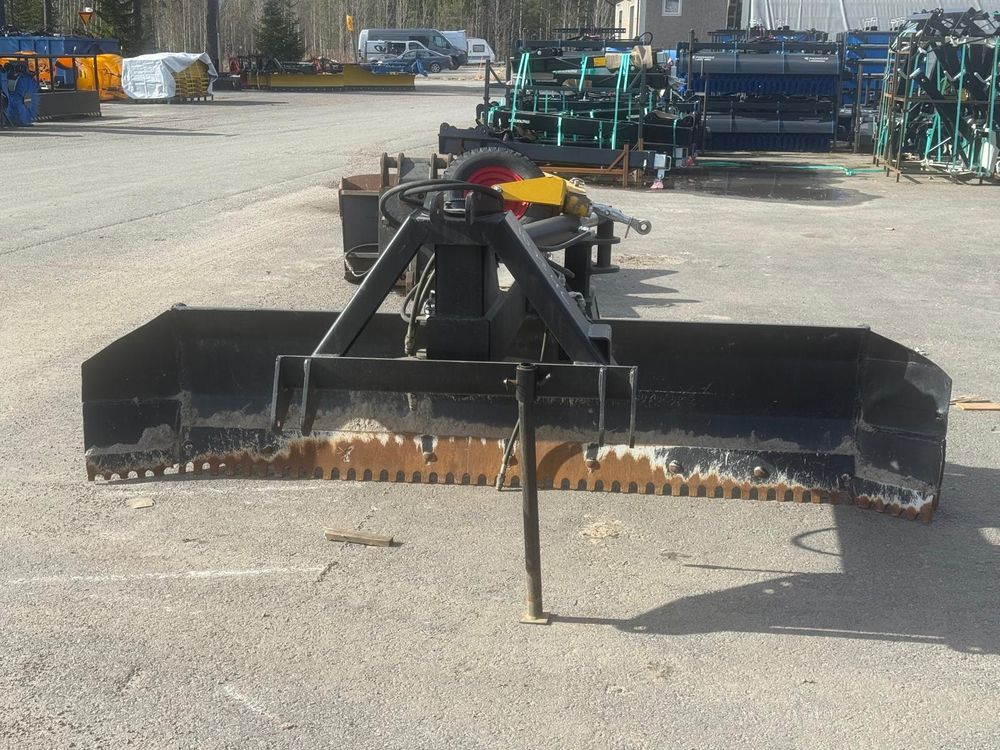 Käytetty hydraulinen takalana 70-110hv traktoreihin. Vakiona hydraulinen levyn- ja rungonkääntö. Irroitettavat ja säädettävät 4.00-8″ tukipyörät. Levynkääntö 270 astetta. Levyn korkeus 63cm. Vankka 90mm kääntöakseli. Sylinterin varsi/mäntä 50/80mm. Hyvät rasvauspisteet. Käännettävä Hardox kampaterä. Työpaino 550kg. Takalanaan tehty molemmin puolin n. 30cm jatkopalat. Tukipyörät irtona mukaan.