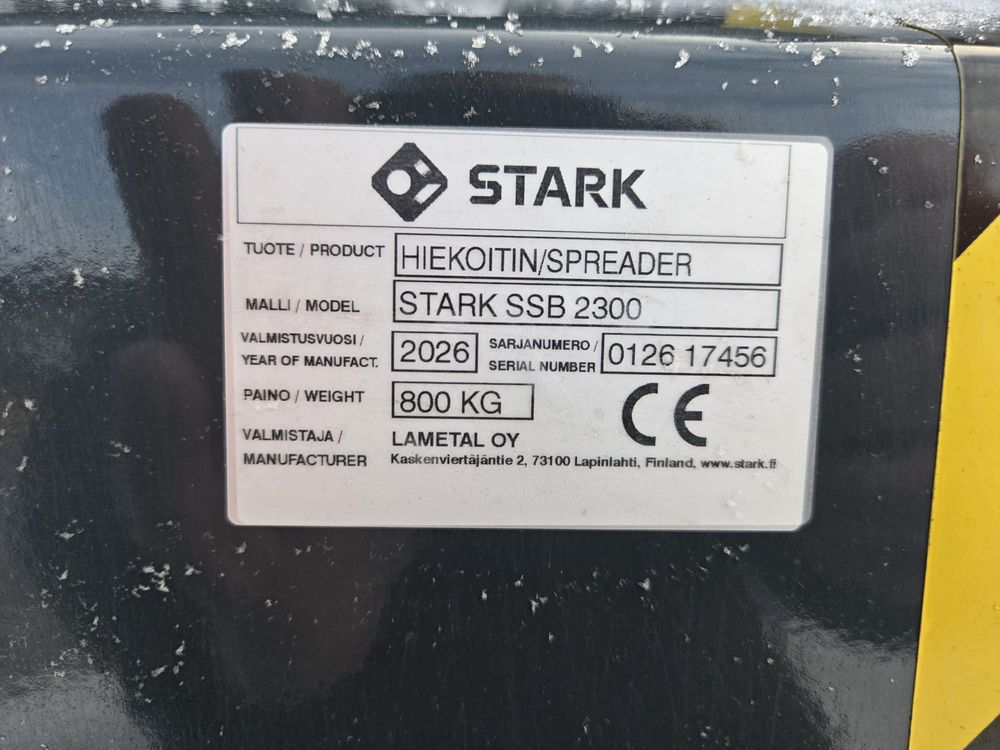 Hiekoituskauha 2300L tilavuudella. Huulileveys 209cm, syvyys 122cm, korkeus 209cm, Paino 700kg-. Hiekoitusleveys 209cm. Tehokas ja tarkka työlaite hiekan, sepelin ja suolan levitykseen 0-16mm raekoolle. Varusteet: Huulilevy kulutusterästä (500 HB), Murskainakseli, Suojakalterit, Kaksoispaineen varoventtiili, virtauksensäätöventtiili, Huomiotarroitus ja heijastimet. Hiekoituskauhaan valittavissa yleisimmät STARK FIT kiinnikkeet.