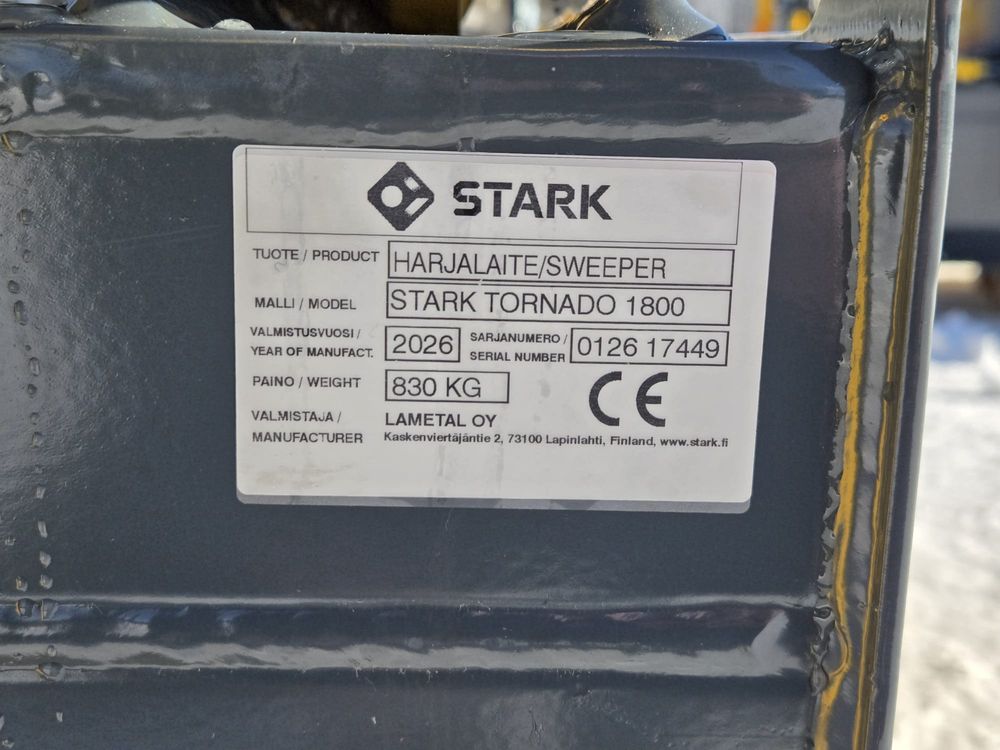 Stark Tornado 1800 kauhaharja. Kauhaharja on suunniteltu suurta puhdistustehoa ja kestävyyttä vaativien kohteiden kuten katujen ja pihojen sekä teollisuusalueiden, satamien ja lajittelukeskuksien puhdistukseen. Sweeper float kellunta -teknologian ansiosta työlaite kelluu korkeus- ja sivuittaissuunnassa vapaasti pintaa myötäillen ja lisää tehokkuutta ja käyttömukavuutta. Tukirullat helpottavat käyttöä ja suojaavat kauhan pohjaa kulumiselta.Kauhan säästöterät ja reunakulutuspalat suojaavat kauhaa, jolloin sitä voidaan painattaa katukivetystä vasten. Työleveys 179cm, Maksimi leveys 197cm, Työleveys 1 sivuharjalla 225cm, Työleveys 2 sivuharjalla 271cm, Roskasäiliön tilavuus 0,8m3, Pääharja 900mm, Vakiovarusteet: hydraulinen harjan nosto, kellunta, pikakiinnitteinen harjatela, pultattavat säästöterät, tukirullat ja reunakulutuspalat. Saatavissa olevat lisävarusteet: Sivuharjat, pölynsidonta- tai 12/24 VDC kastelujärjestelmä, painepesupistooli 15m kelalla, lohkohydrauliikka. Kauharjaan saatavissa Pultattavat Stark Fit sovitteet.