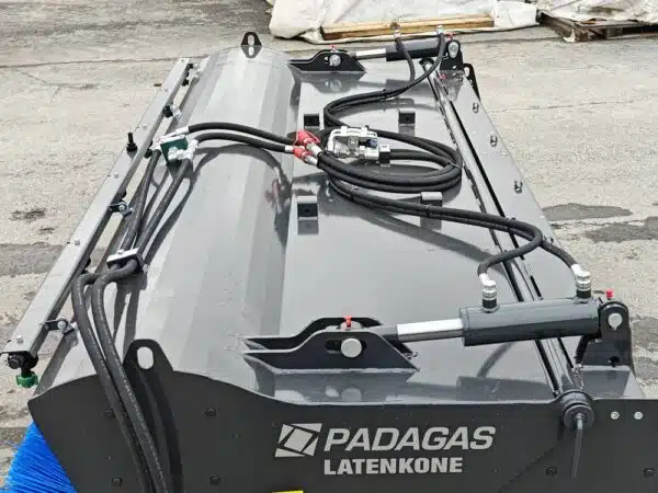 Padagas BS-250 R kauhaharja. Työleveys 2500mm, kokonaisleveys 2800mm. 650mm harja, hydraulinen harjan nosto/tyhjennys. Toiminta 2-letkulla. Kauhan tilavuus 710L, öljyntarve 50L/min, Suositus paine 150bar, Paino 600kg.