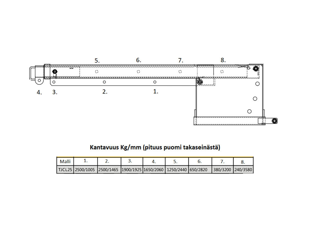 Trukin nostopuomi. Nostopuomin asento muutettavissa. Nostopuomin juuressa trukkipiikeille tupet ja lukitustapit. Maksimi piikkikoko 125x50mm. Puomi säädettävissä viiteen eri pituuteen. Pyörivä nostokoukku. Nostokyky puomin juuresta max2500kg. Pituus piikin juuresta 200cm ja 150cm jatko. Maksimi piikkikoko 130x50mm.
